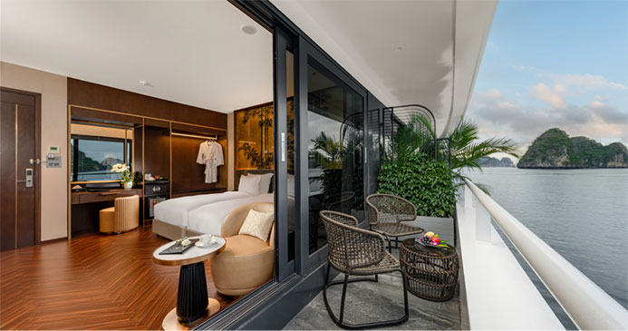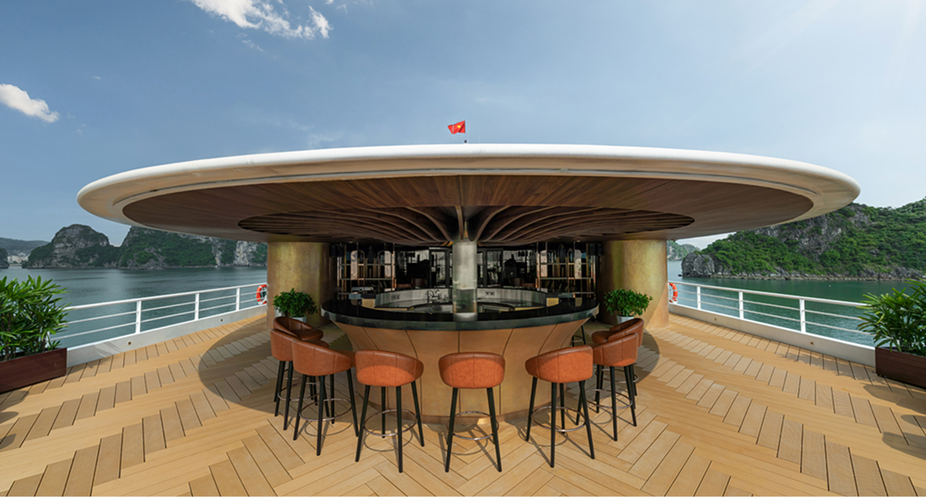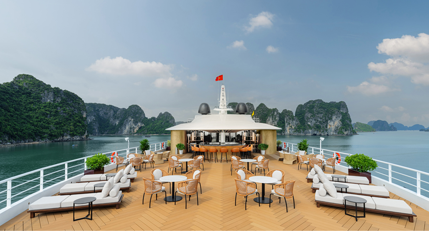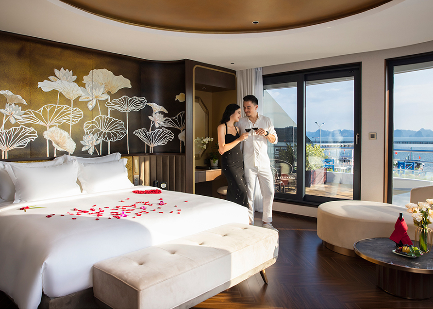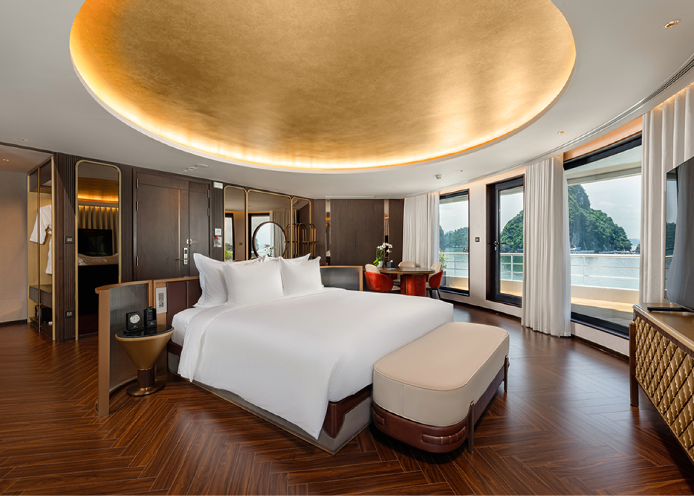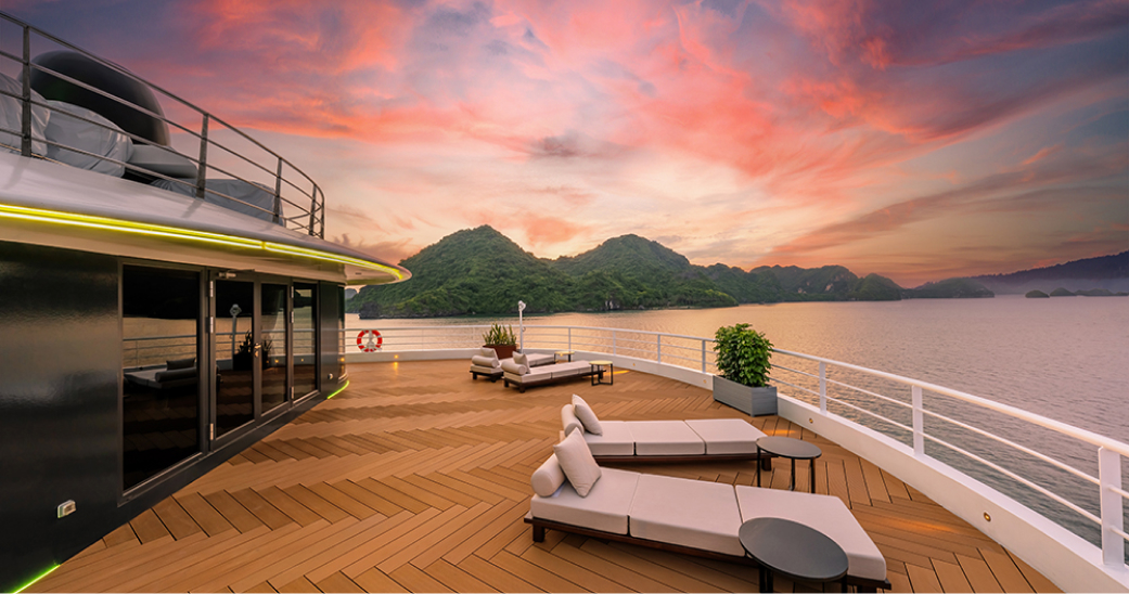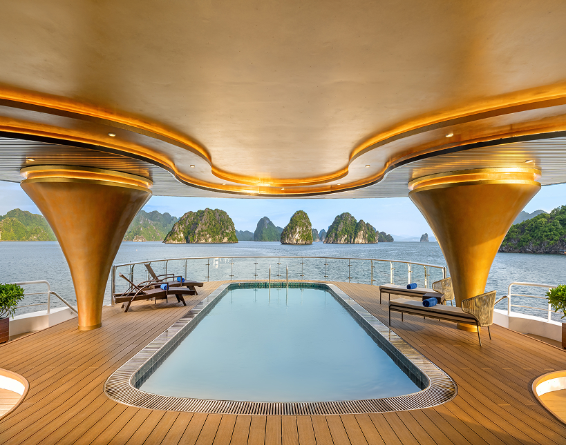 Throughout the day, the vessel changes almost without notice: dawn light shimmering, sunset turning the river into a sheet of glass, and night carrying the hum of Saigon’s energy mixed with the gentle waves of passing boats. Staying here means living with the city’s rhythm, but always at a distance softened by