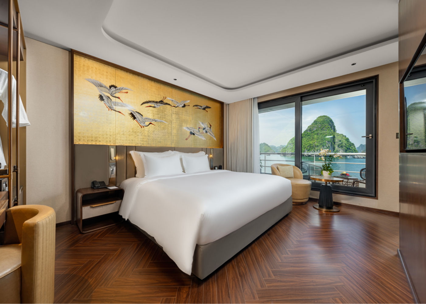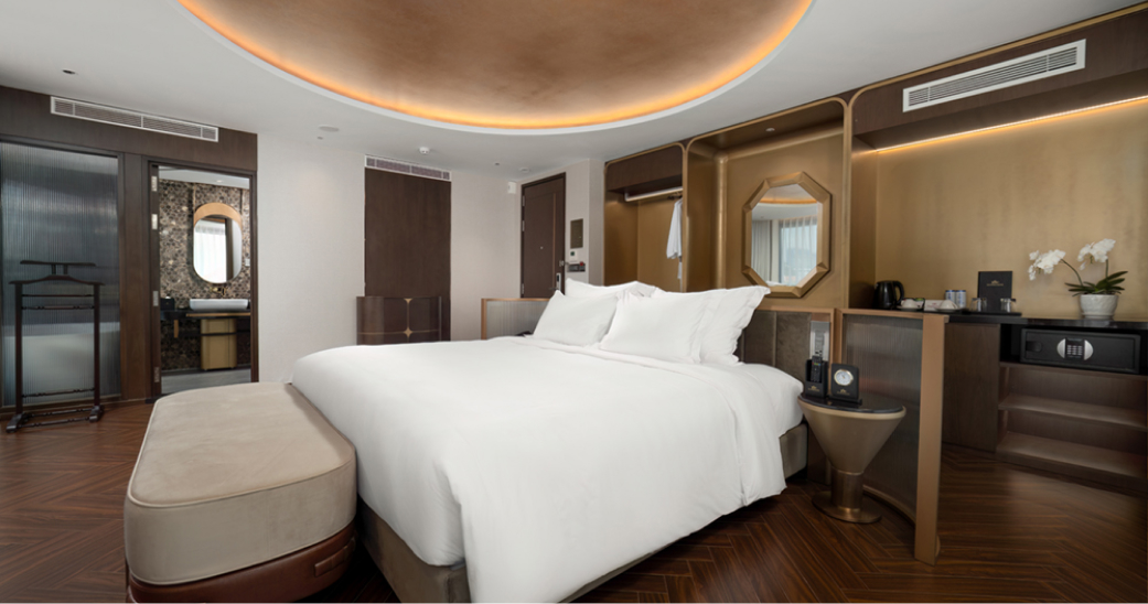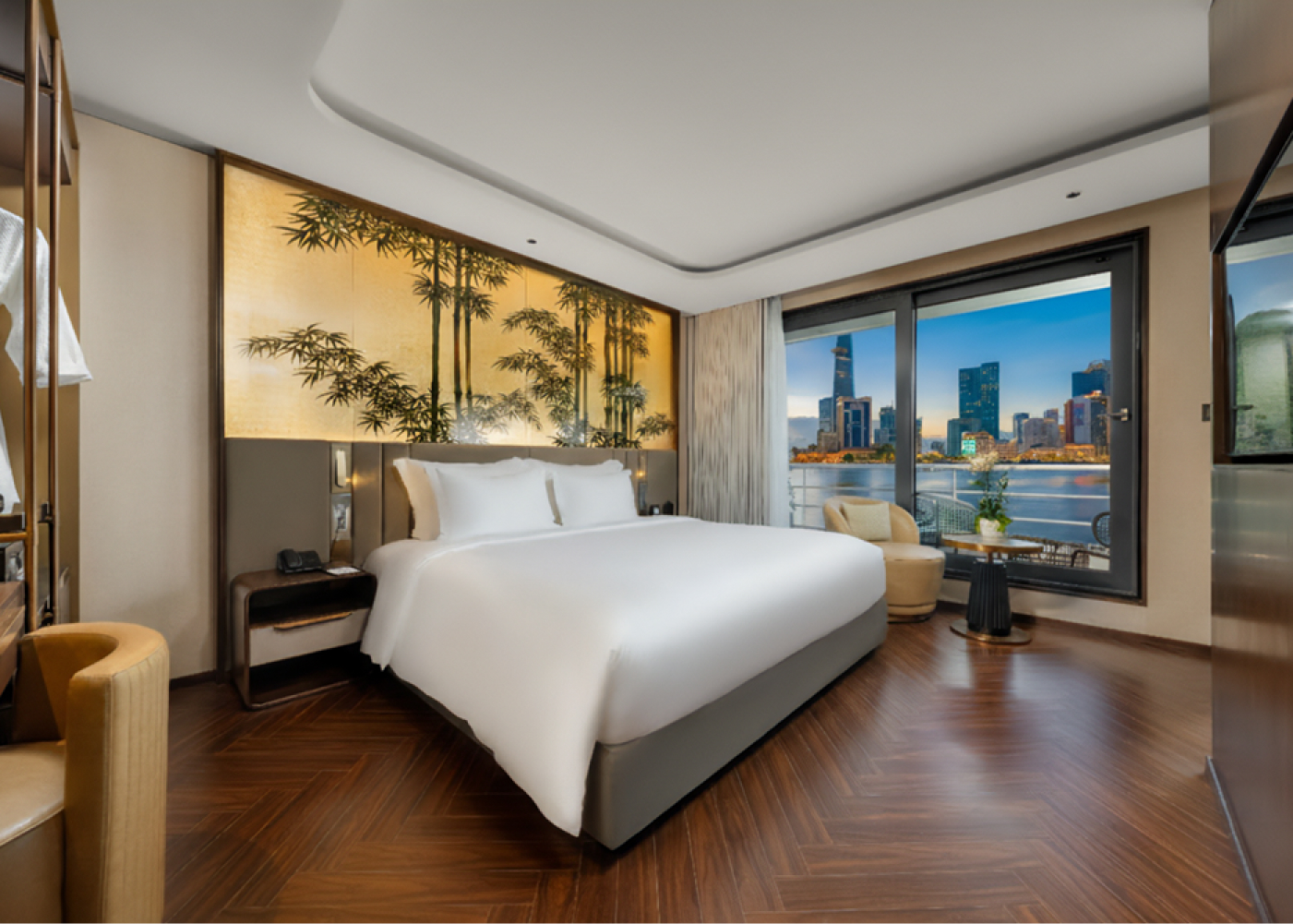 By night, you hear Saigon’s vibrant energy carried across the water, softened by the rhythm of waves from passing boats. Each room is more than a space; it is a vantage point to live with the river, moment by moment.